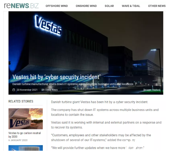 據(jù)外媒報(bào)道,11月20日維斯塔斯遭遇網(wǎng)絡(luò)安全事故,目前已經(jīng)關(guān)閉多個(gè)業(yè)務(wù)部門和地點(diǎn)的信息技術(shù)系統(tǒng),以控制這一問題。