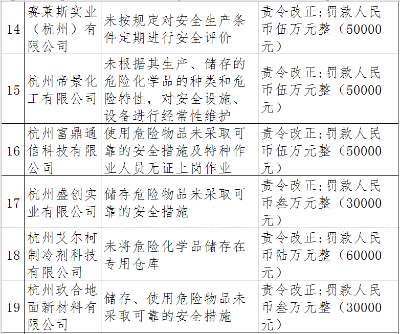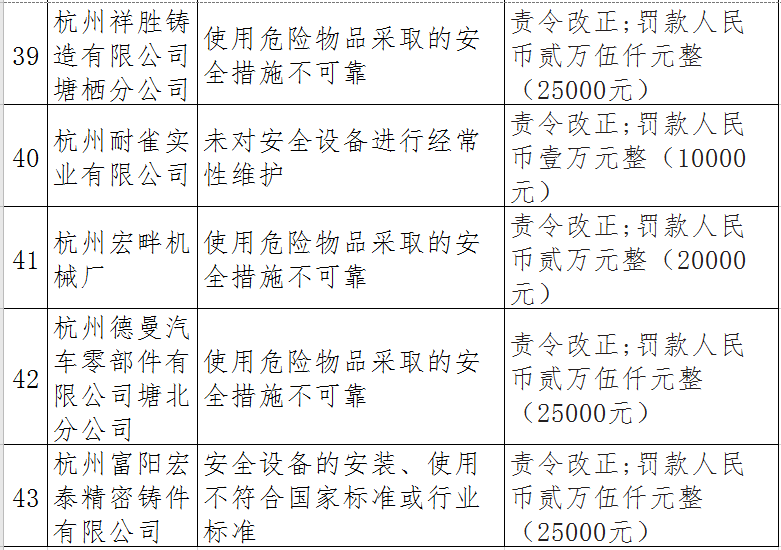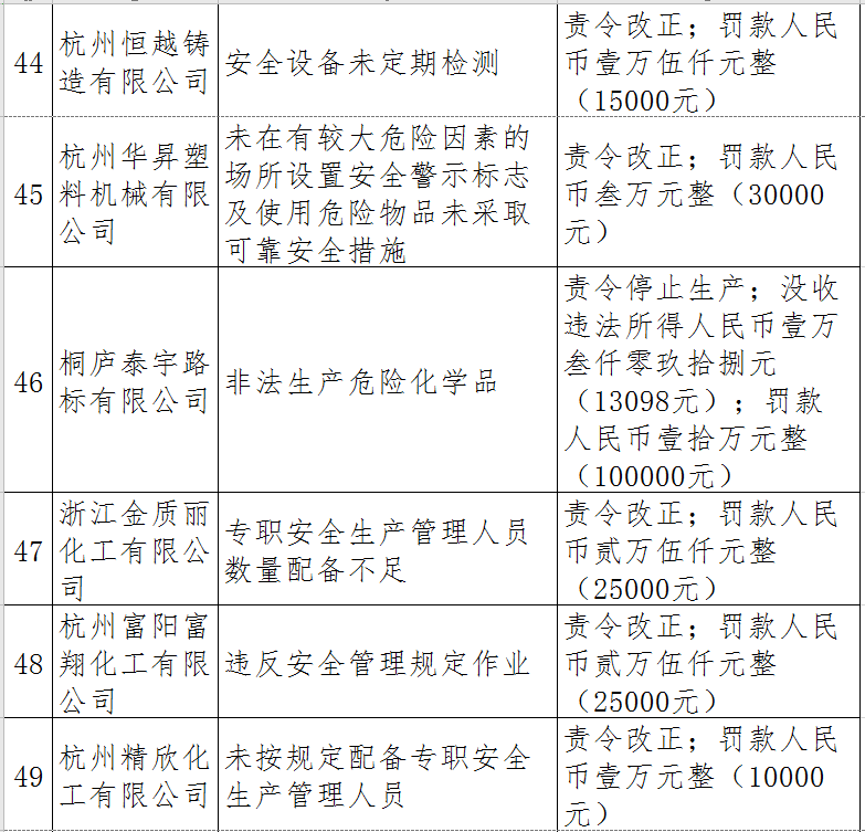 據(jù)了解,今年上半年,杭州市應急管理局一手抓駐企復工復產(chǎn)、一手抓安全生產(chǎn),已完成年度執(zhí)法計劃、專項檢查、聯(lián)合執(zhí)法、信訪舉報核查等,并對檢查中發(fā)現(xiàn)的安全生產(chǎn)違法違規(guī)企業(yè)(個人)進行了處罰。現(xiàn)對52家被行政處罰的企業(yè)(個人)進行曝光,希望各企業(yè)引以為戒!