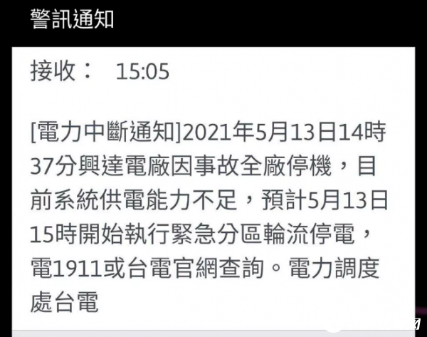 據報道,高雄市今天下午近3時,多個行政區(qū)出現大停電現象,網友抱怨今天天氣30多度,冷氣停電熱到爆。稍早媒體收到“警訊通知”短信,上面寫著“5月13日14時37分興達電廠因事故全廠停機,目前系統(tǒng)供電能力不足,預計5月13日15時開始執(zhí)行緊急分區(qū)輪流停電”。臺電高雄區(qū)處則說,目前正在了解厘清。