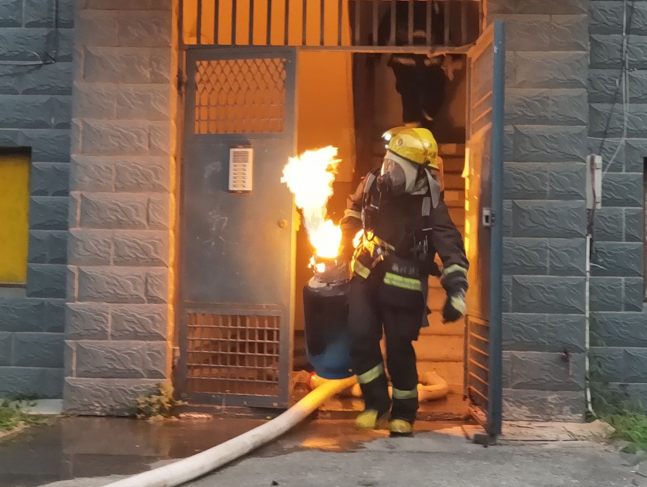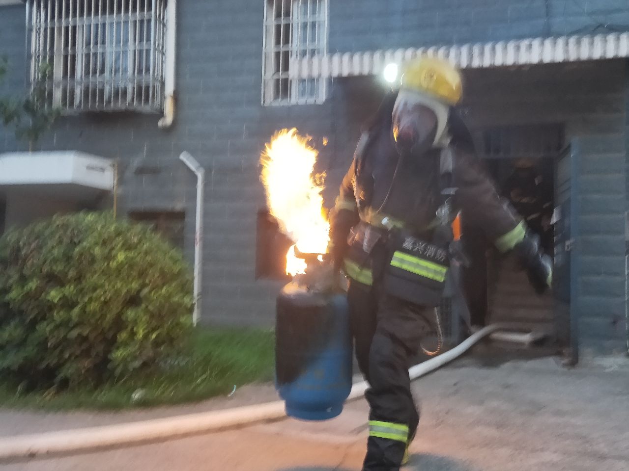 到達(dá)現(xiàn)場消防指戰(zhàn)員發(fā)現(xiàn),著火處物為煤氣罐,該煤氣罐位于居民房內(nèi)廚房里,處于猛烈燃燒階段,隨時(shí)都有爆炸的可能,而且居民樓樓下都住有居民,一旦發(fā)生爆炸,后果不堪設(shè)想。
