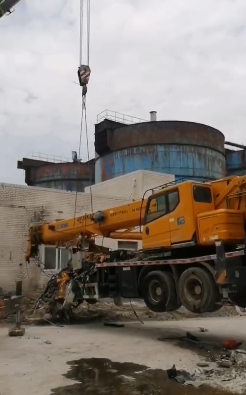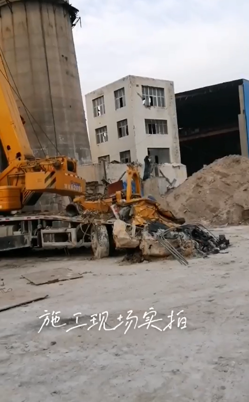 在某電廠內(nèi)容,一臺(tái)25k5吊車正在準(zhǔn)備開始吊裝工作,不料遭遇飛來橫禍,天降重物砸頂,車頭部分瞬間粉碎,幸好人沒有在車上...