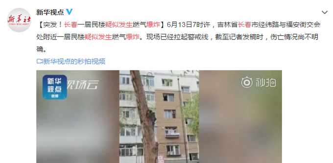 6月13日7時(shí)許,吉林省長(zhǎng)春市經(jīng)緯路與福安街交會(huì)處附近一居民樓疑似發(fā)生燃?xì)獗ā?/span>