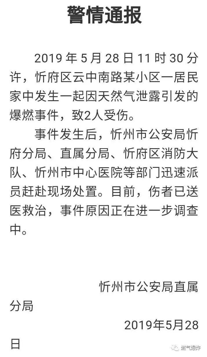 月28日11時(shí)30分許,忻府區(qū)云中南路某小區(qū)一居民家中發(fā)生一起因天然氣泄漏引發(fā)的爆燃事件,致2人受傷。