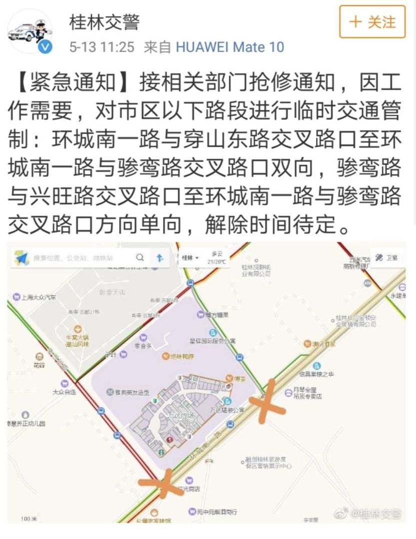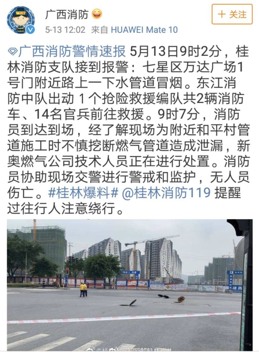 中午12時(shí),@廣西消防官微發(fā)布了一警情速報(bào):5月13日9時(shí)2分,桂林消防支隊(duì)接到報(bào)警:七星區(qū)萬(wàn)達(dá)廣場(chǎng)1號(hào)門(mén)附近路上一下水管道冒煙。9時(shí)7分,消防員到達(dá)到場(chǎng),經(jīng)了解現(xiàn)場(chǎng)為附近和平村管道施工時(shí)不慎挖斷燃?xì)夤艿涝斐尚孤?新奧燃?xì)夤炯夹g(shù)人員正在進(jìn)行處置。消防員協(xié)助現(xiàn)場(chǎng)交警進(jìn)行警戒和監(jiān)護(hù),無(wú)人員傷亡。