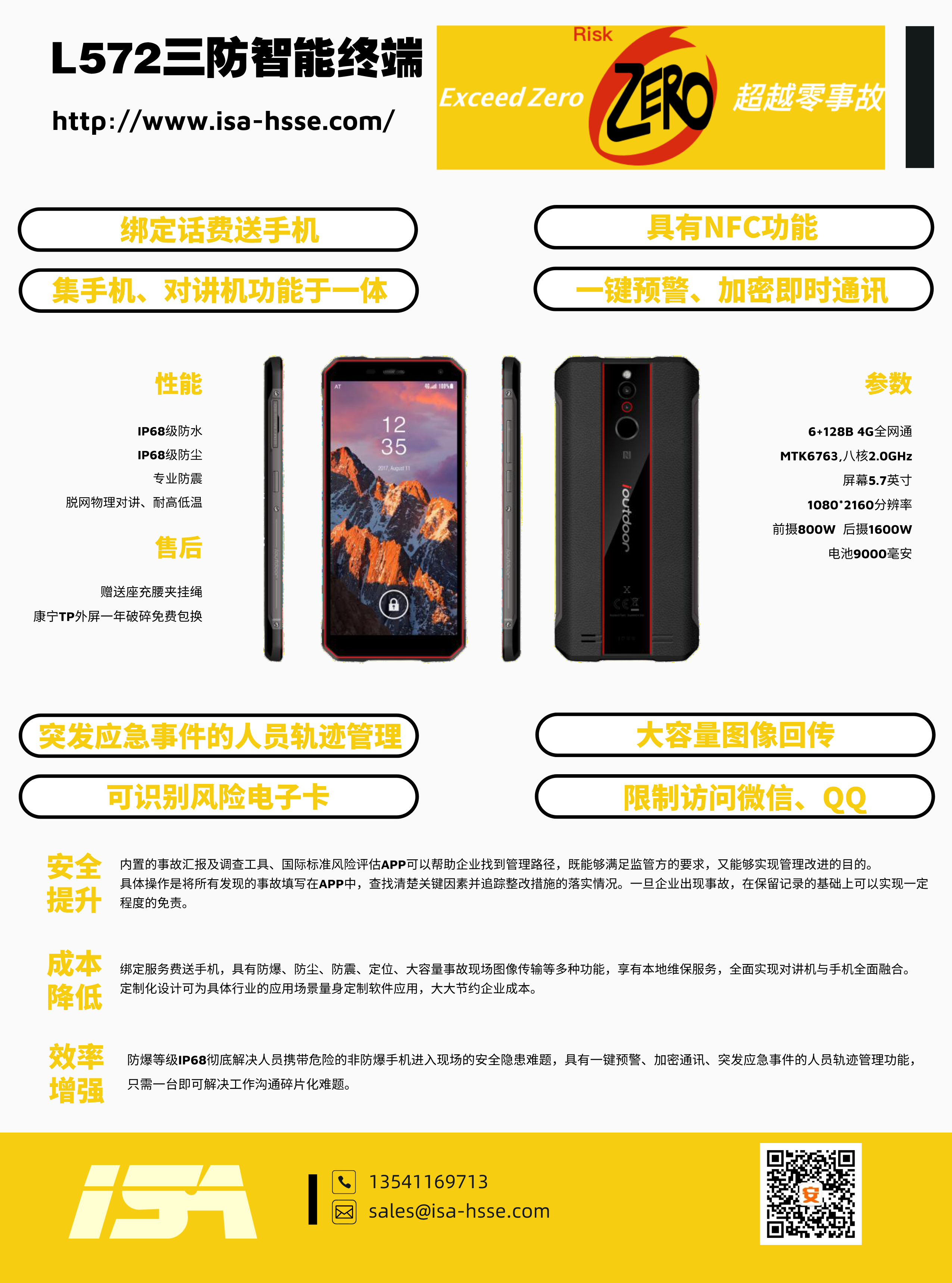 公司與運(yùn)營商推出一款集手機(jī)、對講機(jī)于一體的防爆手持終端,包括各類商業(yè)安全軟件的使用、圖像回傳功能、一鍵報(bào)警、限制訪問微信QQ、NFC等功能。內(nèi)含事故管理APP(隱患排查、風(fēng)險(xiǎn)評估),0元開卡,綁定即送話費(fèi)流量,支持定制化服務(wù)。